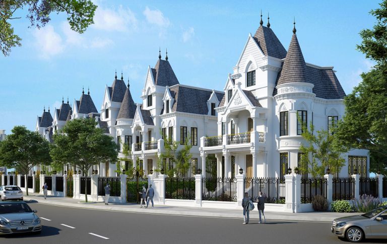 Biệt thự liền kề, biệt thự song lập mang phong cách kiến trúc tân cổ điển Pháp, là sự kết hợp hoàn hảo giữa thẩm mỹ nghệ thuật tinh tế và giá trị sử dụng ưu việt, nhờ những đường nét hoa văn được thiết kế đăng đối, chi tiết thống nhất theo một chuẩn mực vốn có, mà những công trình kiến trúc Pháp từ xưa đến nay chưa bao giờ trở nên lỗi thời và ngày một khằng định vị trí trong lòng những người say đắm kiến trúc Pháp. Phong cách thiết kế kiến trúc đăng đối, nối tiếp nhau trên diện tích 140- 207m2 cho biệt thự liền kề và 305m2 cho biệt thự song lập đối xứng nhau, phù hợp cho gia đình hai đến ba thế hệ cùng chung sống và tận hưởng cuộc sổng đẳng cấp riêng tư. Với chiếu cao 5 tầng, 1 tầng hầm, 3 tầng nổi, 1 tấng mái, trải dài các con phố, cùng với mặt tiền thông thoáng nổi bật với tông màu trắng nhẹ nhàng trang nhã, thanh tao xen kẽ là hệ thống cửa kính hoa văn lấy sáng, cùng hệ mái đá Mansard đen ghi cổ điển trên một tổng thể thống nhất, tái hiện lại bức tranh khu phố sinh động cổ điển của nước Pháp hoa lệ, mà không kém phần sang trọng, đẳng cấp. Đặc biệt hơn, với lợi thế, 2 mặt thoáng đối với biệt thự liền kề và 3 mặt thoáng đối với biệt thự song lập, đảm bảo không gian thoáng rộng, đủ cho các gia chủ có được tầm nhìn tuyệt mỹ, từ những ô cửa kính và ban công thoáng đãng, đến không gian mở giao hòa với thiên nhiên, tạo nên một không gian sống mới mẻ, hòa mình với thiên nhiên.